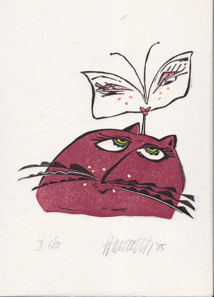 Tobias Trauzettel - o.T. (Kater /Schmetterling) - Linolschnitt farbig - II 10/16 - Blattmass: 30,3 x 21,5 cm - 1998 - signiert - - 85,- € - - (#tt075)