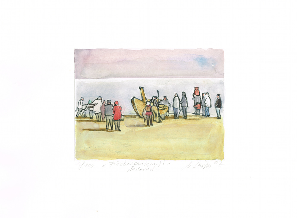 Volker Köpp "Fischerankunft" 2007, 12/100, signiert, handkolorierte Aquatintaradierung, Blattmass: 30 x 39,5 cm, Bildmass: 14,5 x 19,5 cm, 120,- €