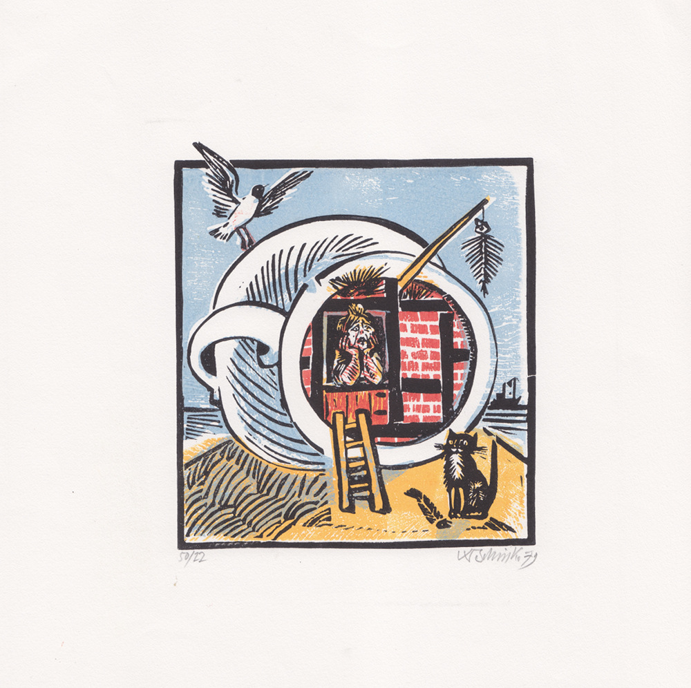 Werner Schinko "o.T., Fischers Frau im Pott" 1979, 50/22, signiert, Handsiebdruck, Blattmass: 20,5 x 21 cm, Bildmass: 12 x 10,5 cm, 116,- €